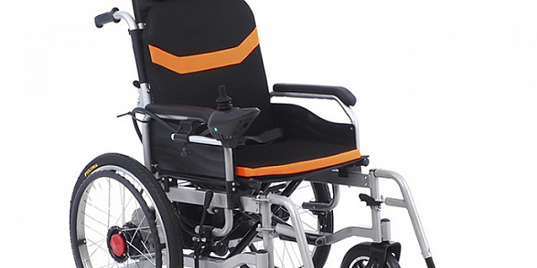 Электрическое кресло-коляска со съёмным удлинением спинки, ортопедическим подголовником и приводными колёсами, позволяющими энергонезависимое перемещение